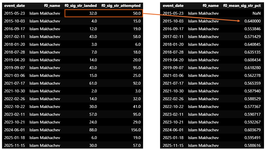 L’image ci-dessous illustre la différence entre un dataset de statistiques brutes par combat et un dataset de modélisation correctement temporalisée pour le calcul du pourcentage moyen de coups significatifs.