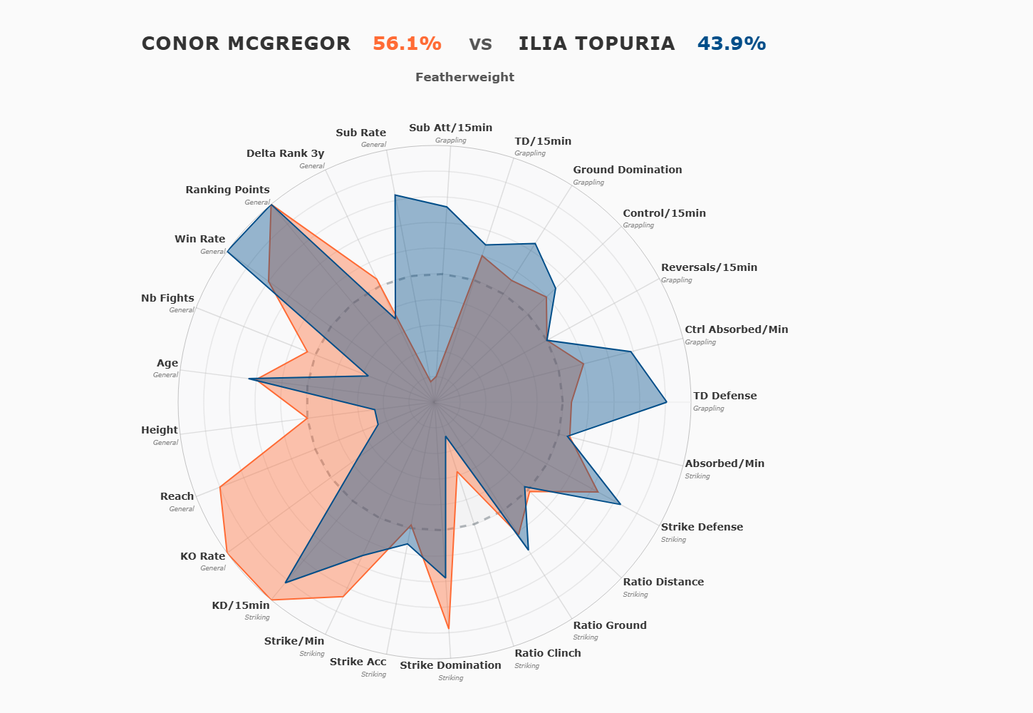 Conor légèrement favori (56.1%), mais Topuria très dangereux (43.9%).