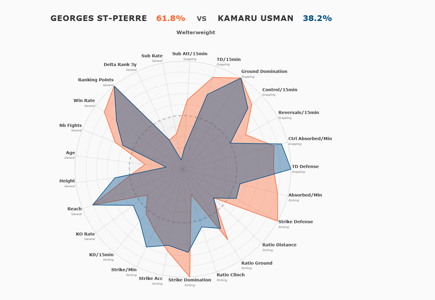 GSP favori clair (61.8%), mais Usman reste dangereux (38.2%). Ce n’est pas un écrasement. 62-38 signifie que si ce combat avait lieu 100 fois, GSP gagnerait 62 fois, Usman 38 fois. Presque 40% de chances pour Usman.
