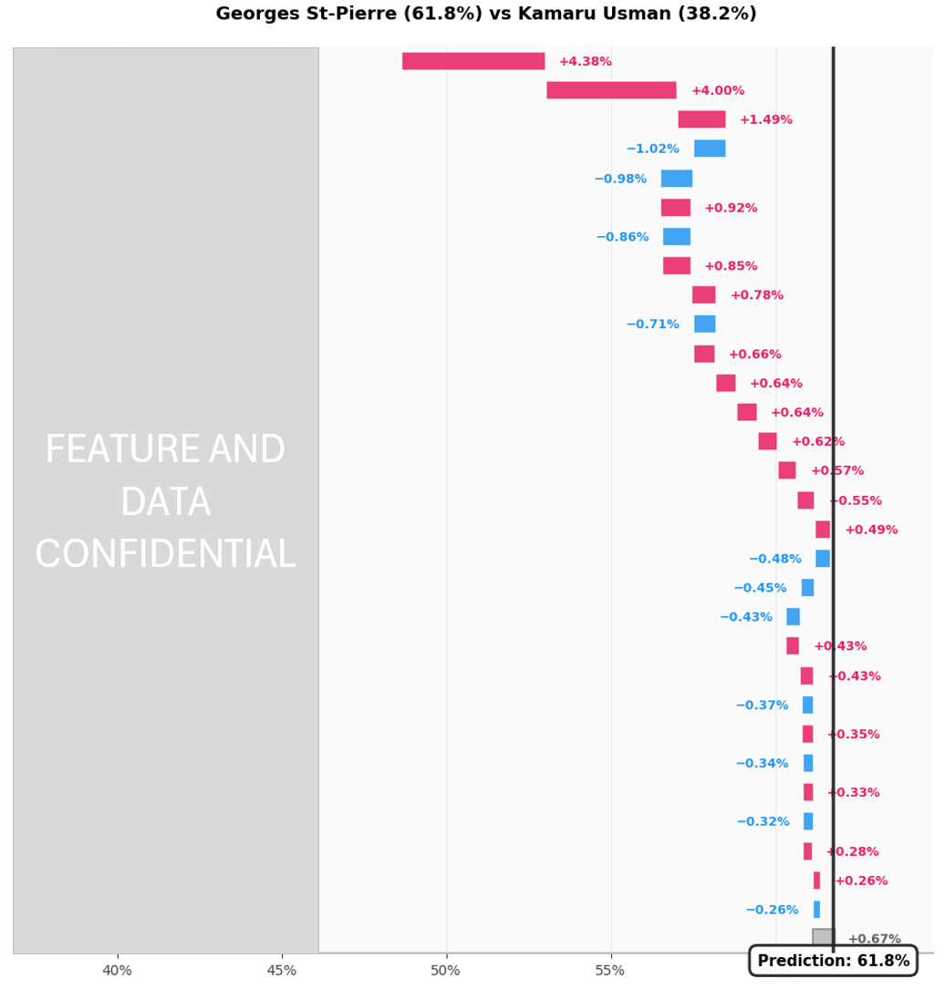 En face, Usman récupère des contributions liées à sa domination au sol supérieure, sa défense de takedown parfaite, son volume de frappe et sa puissance. Ces éléments offrent des chemins de victoire plausibles : imposer sa pression physique, étouffer GSP contre la cage, l’user late rounds, ou chercher le finish via ground and pound ou striking puissant. La somme des facteurs favorisant GSP dépasse nettement ceux favorisant Usman, expliquant la prédiction 62-38. Mais Usman reste dangereux via sa pression et son athlétisme.