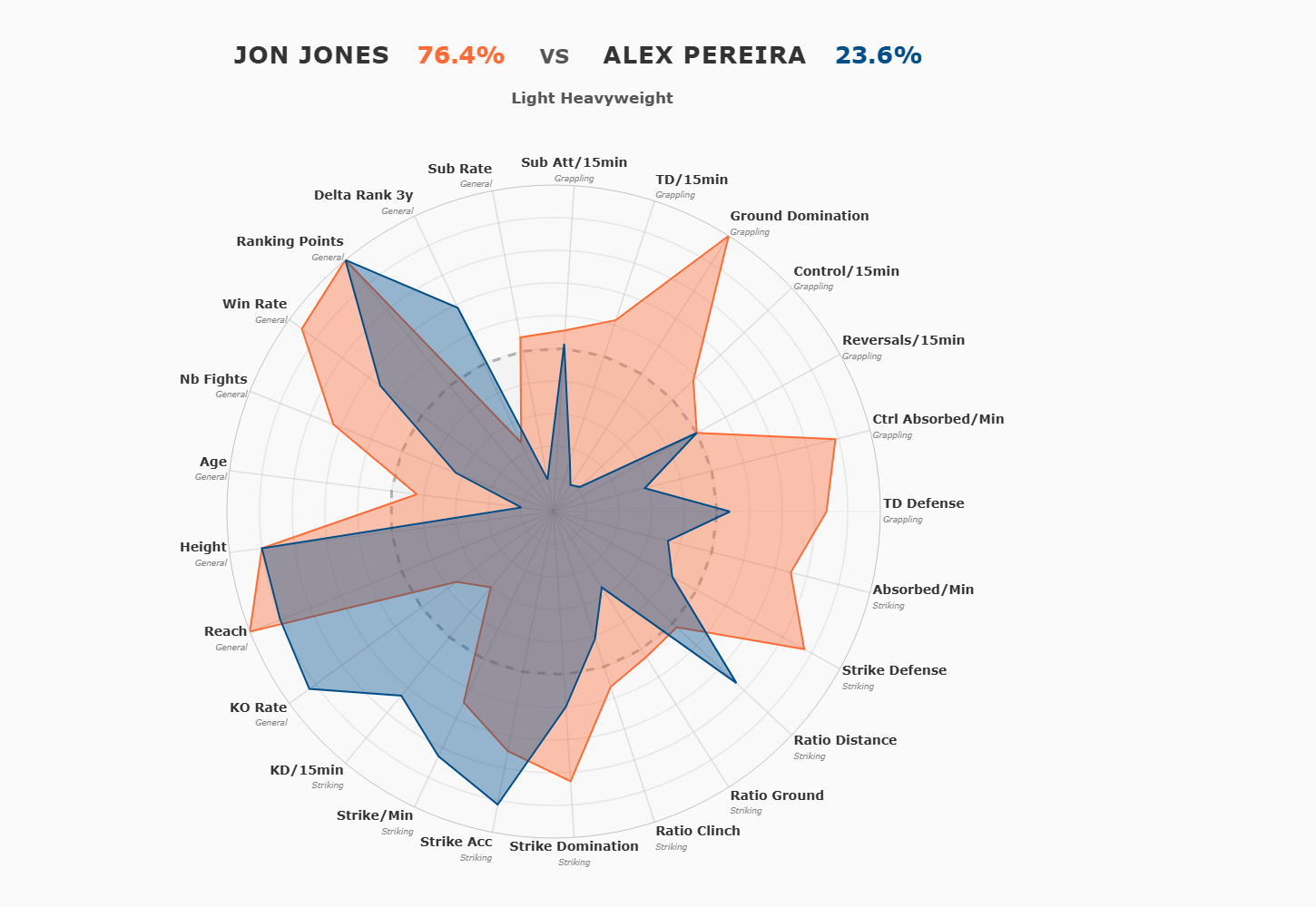 Pereira porte 79% de ses coups à distance contre 61% pour Jones. C’est là qu’il est le plus dangereux, en kickboxing range, où il peut utiliser ses low kicks et son left hook dévastateur. Jones portait 20% de ses coups au sol et 19% au clinch, zones où Pereira n’a que peu de réponse.